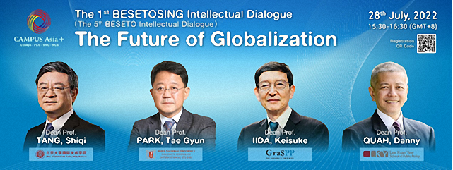 On the afternoon of July 28, 2022, the 1st CAMPUS Asia+ BESETOSING Intellectual Dialogue and the 5th CAMPUS Asia BESETO Intellectual Dialogue) were successfully held online with the theme of the Future of Globalization. Four distinguished guests attended the event and made wonderful speeches, including Tang Shiqi, Dean of the School of International Studies, Peking University; Keisuke Iida, Dean of the Graduate School of Public Policy, The University of Tokyo; Park Tae Gyun, Dean of the Graduate School of International Studies, Seoul National University, and Danny Quah, Dean of the Lee Kuan Yew School of Public Policy, National University of Singapore. This event was presided over by Dong Zhaohua, Associate Dean of the School of International Studies, Peking University, and opened to students and alumsfrom four universities to watch online. Over 60 scholars and students attended this event.