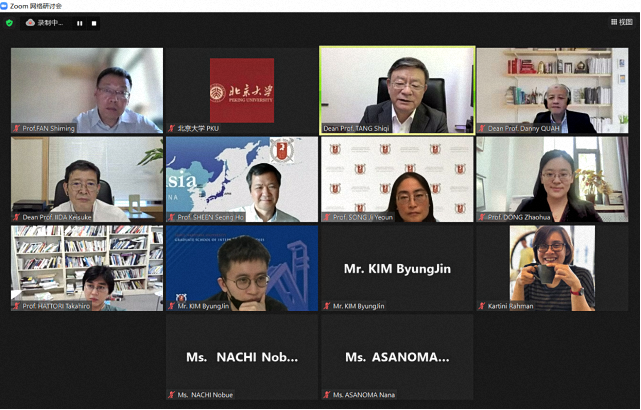 On the afternoon of July 28, the 15th BESETOSING CAMPUS Asia Joint Academic Board Meeting was held online. Many guests attended the meeting, including Dong Zhaohua, Associate Dean of the School of International Studies; Zhang Jingxue, representative of the Office of International Programs, School of International Studies, Peking University; Professor Sheen Seong-Ho, Director of the BESETOSING CAMPUS Asia Program, Kim Byungjin, Program Supervisor from the Graduate School of International Studies, Seoul National University; Takahiro Hattori, Professor at the Graduate School of Public Policy; Nobue Nachi, Senior Manager of the BESETOSING CAMPUS Asia Program, and Nana Asanoma, contact person of the Program, The University of Tokyo; and Kartini Binte Abdul Rahman, Supervisor of the BESETOSING CAMPUS Asia Program, National University of Singapore. The meeting was presided over by Dong Zhaohua.