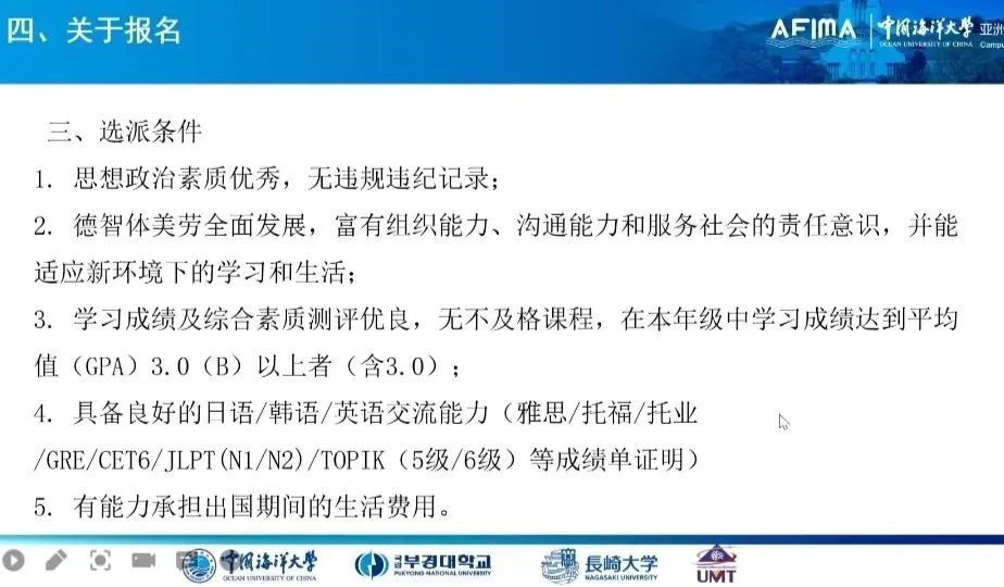 In terms of expenses, candidates will be provided with airfare for an international round trip and accommodation subsidy (living allowance) based on relevant standards set by the China Scholarship Council. Candidates should bear the visa application fees, living costs while abroad, insurance expenses, etc. Living costs in Japan and the ROK are moderate, roughly equivalent to those in Qingdao.