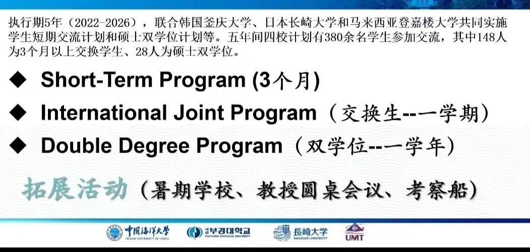 From 2022 to 2026, the Ocean University of China (OUC) will join hands with Pukyong National University of the ROK, Nagasaki University of Japan, and Universiti Malaysia Terengganu to implement short-term programs, master’s double degree programs, and other programs. More than 380 students are planned to participate in the exchange programs over these five years, among which 148 will take part in international joint programs over three months and 28 in master’s double degree programs.