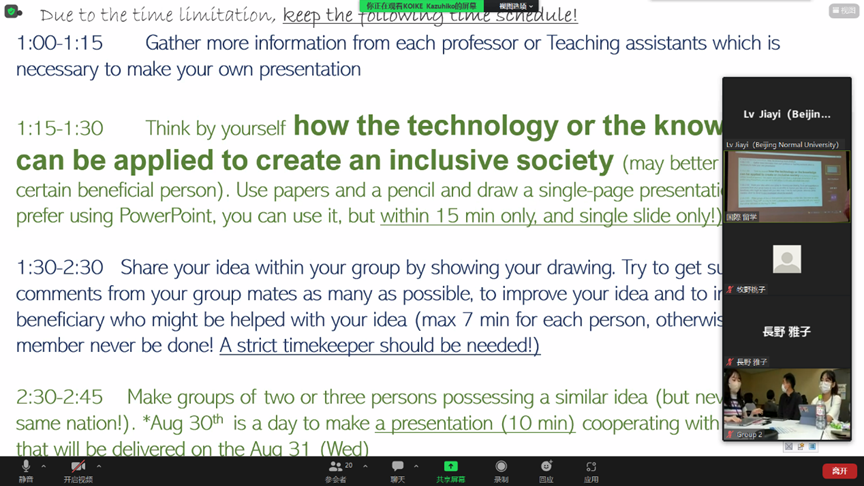 What impressed me most was the day of the group discussion. Because of the poor network, I could not keep up with our discussion. Thankfully, my groupmates were so tolerant that they displayed the images in front of the camera to make it clearer and easier for me to see in our remote communication. In addition, after the class discussion, I was flattered that Professor Yanamoto invited a senior student to be an interpreter in order to understand my difficulties and specific circumstances as a remote participant in the discussion.